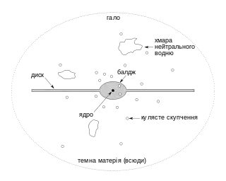 - диск є плоским утворенням, що обертається, яке складається з міжзоряної речовини, молодих зір «Населення I» і розсіяних зоряних скупчень.