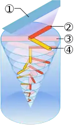 Ефект екманівської спіралі 1. Вітер, морська течія; 2. тертя; 3. напрямок вітру, течії; 4. сила Коріоліса.
