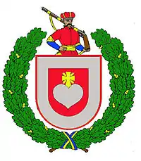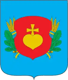 У срібному полі червоний щиток із срібним серцем, що увінчане сяючим золотим лицарським хрестом. У клейноді — герб війська Запорозького «козак із самопалом» у вигляді козака у червоному кунтуші із закоченими рукавами, синьому жупані, шапці з червоним верхом та сірою опушкою, золотим поясом та підбивкою кунтуша. Щит оточений вінком із дубових гілок із зеленим листям та золотими тринадцятьма жолудями, що перевиті знизу жовто-блакитною стрічкою.