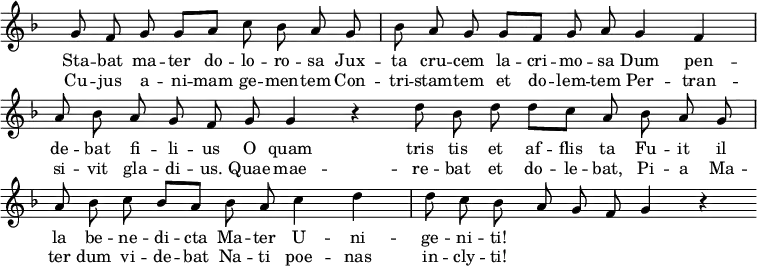 Stabat mater dolorosa Cuius animam gementem, O quam tristis et afflicta Quae maerebat et dolebat, Quis est homo qui non fleret, Quis non posset contristari Pro peccatis suae gentis Vidit suum dulcem Natum Eia, Mater, fons amoris Fac, ut ardeat cor meum Sancta Mater, istud agas, Tui Nati vulnerati, Fac me tecum pie flere, Iuxta Crucem tecum stare, Virgo virginum praeclara, Fac, ut portem Christi mortem, Fac me plagis vulnerari, Flammis ne urar succensus, Christe, cum sit hinc exire, Quando corpus morietur, |