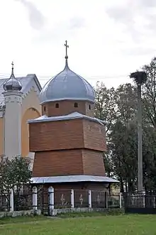Поруч з церквою розташовується дерев'яна дзвіниця, яку було зведено на початку ХІХ століття. Дзвіниця є квадратною в плані, трьохярусною каркасною конструкцією, яка завершена куполом на восьмерику. Перший ярус оточений піддашшям на кронштейнах. На другому ярусі прорізано по два прямокутних отвори з кажної сторони. На восьмерику є невеликі напівциркульні отвори. За формою і стильовими особливостями споруда нагадує дерев'яну оборонну башту.[5] Початково дзвіницю було покрито вертикальною шалівкою[5], яку після останнього ремонту замінили на горизонтальну[джерело?].