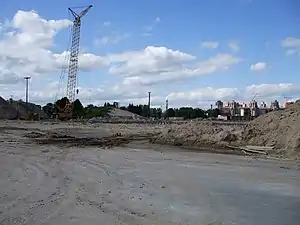 Знесення стадіону було розпочато ще в березні 2006 року, протягом півроку виконано демонтаж всіх глядацьких місць й трибунних огорож. Активна фаза робіт стартувала 7 вересня 2006 року, протягом осені виконано демонтаж обох інформаційних табло, чотирьох освітлювальних щогл й бетонних сходів[5]. До початку зими роботи з демонтажу стадіону були виконані більш ніж на дві третини, проте уламки знесених щогл й інше сміття складали на футбольному полі аж до початку весни наступного року. Після очищення території колишнього футбольного поля від сміття на його місці почалися роботи зі зведення пальового поля для нової арени, паралельно розпочато демонтаж земляного валу. Знесення стадіону завершився влітку 2007 року, в основу нового стадіону закладений перший камінь.