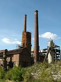 Виведена з експлуатації доменна піч на металургійному заводі міста Стараховиці. Саму доменну піч на фото майже не видно, вона праворуч, але біль-менш добре видно каупери в центрі фотографії