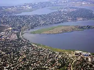![]() Старий Водопій На передньому плані — Старий Водопій, за ним — півострів Аляуди, далі півострів Ракетне Урочище. На іншому березі (зліва направо) — Соляні, мікрорайон Північний. | ||||||