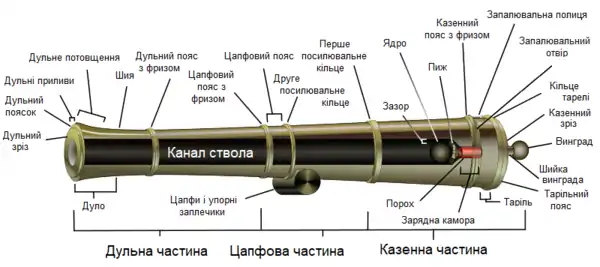 Ствол є трубою, внутрішня порожнина якої називається каналом. Канал ствола складається з камори, де поміщається метальний заряд, і провідної частини. На зовнішній поверхні ствола, розташованій над каморою, раніше ставилося спеціальне клеймо, що вказувало на приналежність гармати державі (казні), тому за цією частиною ствола історично збереглася назва казенної. Протилежна частина ствола отримала назву дульної.