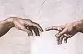 Бог зображений як літній чоловік із білою бородою, у білій туніці. Його несуть ангели, а його ліва рука обіймає й захищає постать, яку вважають за Єву[а] чи Марію. Величний Бог простягає праву руку до лівої руки Адама, який піднімається із землі назустріч Творцеві. Їхні пальці майже торкаються, рука Бога дає іскру життя Адаму, а той приймає її. Дзеркальне відображення Адамом руху Бога є ще одним натяком на те, що Бог створив людину «на свою подобу».
