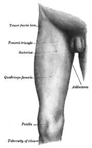 Стегно обмежено зверху спереду пахвинною зв'язкою, зверху ззаду — сідничною складкою, знизу — лінією, проведеної на 5 см вище надколінка. Основа стегна — стегнова кістка. Стегно має одну кістку — стегнову, рухи якої (згинання/розгинання, обертання, абдукція/аддукція) управляються кількома групами м'язів.