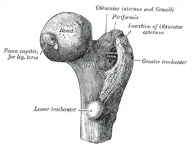 Верхня частина чи проксимальний епіфіз стегнової кістки (epiphysis proximalis femoris) включає головку стегна, шийку стегна й два вертлюги з прилеглими структурами[1].