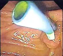 | Біліарні стенти забезпечують відведення жовчі з жовчного міхура, підшлункової та жовчних шляхів у дванадцятипалу кишку при таких станах, як висхідний холангіт через блокування каменем. | ![]() Ендоскопічне зображення біліарного стенту з боку ампули Фатера, зроблене під час дуоденоскопії |