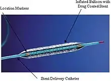 | Коронарний стент імплантується під час крізьшкірної коронарної інтервенції, чи ангіопластики. Найчастіше коронарний стент імплантують в коронарні артерії. З цією метою застосовують металеві стенти, стенти, що виділяють лікарські препарати, стенти з біодеградовним чи комбінованим покриттям тощо. | ![]() Коронарний стент |