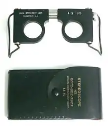 Кишеньковий стереоскоп з тестовою картинкою (використовується у військовій фотографії для дослідження стереопар). - Стереоскоп — оптичний прилад з двома окулярами, зазвичай використовується для перегляду стереослайдів.
