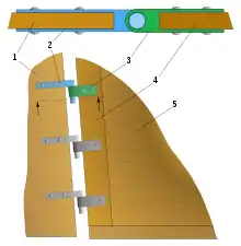 Надводну частину пера з корпусом може з'єднувати трос чи ланцюг — сорлінь. Це робиться для того, щоб не загубити перо, якщо воно випадково зіскочить зі стернових штирів[47]. Крім сорліня, до верхньої частини пера з обох боків можуть кріпитися руль-шкентелі[48] — два троси чи ланцюги, якими за допомогою руль-талів повертають стерно в разі поломки румпеля або балера[49].