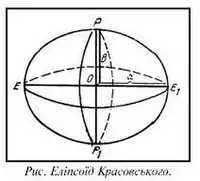 На еліпсоїді Красовського а = 1 : 298,3, що відповідає а - b = 21,4 км.