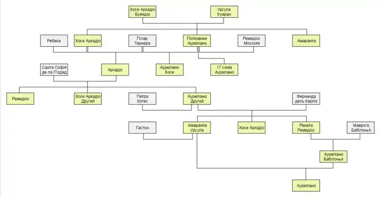 Історія починається з відносин між Хосе Аркадіо Буендіа і його двоюрідною сестрою Урсулою, які росли разом в старому селищі і багато раз чули про свого дядька, що мав свинячий хвостик. Згодом Хосе Аркадіо (син засновника) одружився з Ребекою, прийомною дочкою, яка була йому далекою родичкою. Аркадіо був народжений від Пілар Тернерa, і не підозрював, чому вона не відповідала на його почуття, тому що не знав нічого про своє походження. Ауреліано Хосе закохався в свою тітку Амаранту, запропонував їй одруження, але отримав відмову. Також можна назвати близькими до любові відносини між Хосе Аркадіо (сином Ауреліано Другого) і Амарантою, теж невдалі. Зрештою розвиваються відносини між Амарантою Урсулою і її племінником Ауреліано Вавилоном, які навіть не підозрювали про свою спорідненость, оскільки Фернанда, бабуся Ауреліано і мати Амаранти Урсули, приховала таємницю його народження.