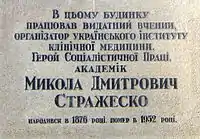 - на фасаді будинку по вулиці Саксаганського, 75, де раніше містився Український науково-дослідний інститут клінічної медицини імені М. Д. Стажеска (мармур, встановлена 5 березня 1954 року, архітектор Ісроель Шмульсон; замінена в 1975 році на гранітну)[5];