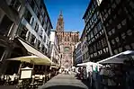 Страсбурзький собор вважається шедевром готичного мистецтва. Перший камінь у фундамент будівлі було закладено 1015 року, а нинішній вигляд собору відноситься до 1439 року. Завдяки легкому та витонченому шпилю, що вознісся на висоту 142 метри, собор аж до XIX століття був найвищою християнською церквою. Фасад собору оздоблено сотнями скульптур, в інтер'єрі — вітражі XII—XIV століття, монументальний орган та астрономічний годинник, механізм якого датується 1842 роком.