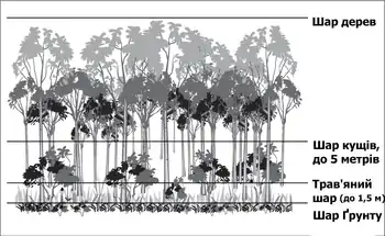 Розрізняють такі шари: коренів, ґрунтів, трав, кущів та дерев.