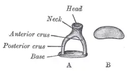 ![]() Стрімінце на малюнку з Анатомії Грея. A — будова стрімінця: голівка (head), шийка (neck), передня ніжка (anterior crus), задня ніжка (posterior crus), основа (base); B — вигляд знизу | |