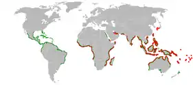 Парк морського життя SUMA (Кобе, Японія) ![]() ██Розповсюдження мангрових лісів ██ Розповсюдження мулистих стрибунів | ||||||||||||||||||||||||||||
