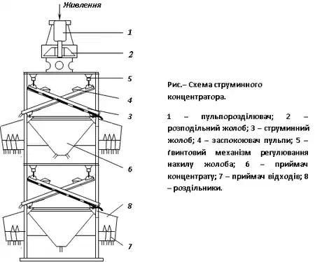 Струминний концентратор СКГ-2М (рис.) складається з 24 струминних жолобів.