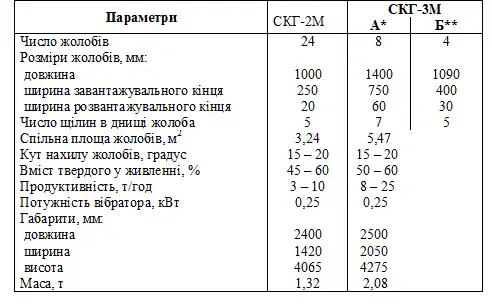 Особливість жолобів струминного концентратора Гіредмету — наявність в днищі поперечних щілин розміром 0,5 — 2 мм для виділення концентрату з придонного шару потоку. Наявність щілин забезпечує зниження втрат цінних мінералів у відходах. В процесі експлуатації щілини періодично прочищаються за допомогою вібратора. В концентраторі СКГ-3М число жолобів знижено до 12, але розміри їх більші.
