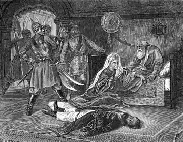 Дії стрільців в такому випадку не мали виправдання і могли розцінюватися як бунт, в той час як самі вони претендували на роль захисників держави і вартових законності. У цей час князь Михайло Долгоруков[20] став кричати на стрільців, звинувачуючи їх в злодійстві[21], зраді і погрожуючи суворою розправою. Це підірвало напружений до межі натовп, стрільці піднялися на ганок і скинули Долгорукова на підставлені списи.