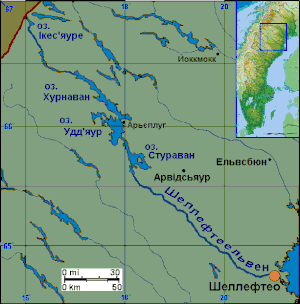 Озеро Стураван на карті річки Шеллефтеельвен. | ||||