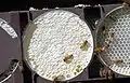 Виробництво стільникового меду за допомогою обладнання Росс Раунд: центральний стільник залитий і запакований бджолами, праворуч - в процесі.