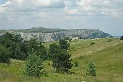 Тирке-яйла. Стіл-Гора (середній план) і Довга гора та Тирке (задній план). Вид з Демерджі (передній план).