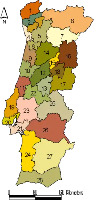 1 — Мінью-Ліма; 2 — Кавад; 3 — Аве; 4 — Великий Порту; 5 — Тамега; 6 — Ентре-Доуру-і-Воуг; 7 — Доуру; 8 — Алту-Траз-уш-Монтеш; 9 — Байшу-Воуг; 10 — Байшу-Мондегу; 11 — Пиньял-Літорал; 12 — Пиньял-Интериор-Норте; 13 — Пиньял-Интериор-Сул; 14 — Дан-Лафойнш; 15 — Серра-да-Ештрела; 16 — Бейра-Інтеріор-Норте; 17 — Бейра-Інтеріор-Сул; 18 — Кова-да-Бейра; 19 — Оеште; 20 — Великий Лісабон; 21 — Півострів Сетубал; 22 — Медіу-Тежу; 23 — Лезірія-ду-Тежу; 24 — Алентежу-Літорал; 25 — Алту-Алентежу; 26 — Алентежу-Сентрал; 27 — Байшу-Алентежу; 28 — Алгарве.