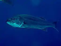 Тіло видовжене, сплюснуте з двох боків. Воно вкрите дрібною лускою. На тілі добре проглядається бокова лінія. Спина має блакитно-оливковий колір. Боки сірого, а живіт сріблястого кольору. Помітні темні плями на спинному плавнику. Рот великий, косий, нижня щелепа сильно видається вперед.