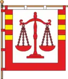 Квадратне біле полотнище, на якому червоні терези, має по бічним і нижній сторонах червону облямівку в 1/8 ширини прапора. Верхня половина бічних смуг облямівки поділена на шість рівновеликих частин, перемінно червоні і жовті.