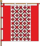 Квадратне полотнище розділене на три вертикальні смуги – червону, білу, червону, у співвідношенні 11:28:11; на середній смузі стилізована волинська вишивка з червоних восьмикутних зірок, розташованих на вершинах ромбів, сторони яких утворені чорними вишитими нитяними гілочками, в ромбах покладені червоні стилізовані грона калини.