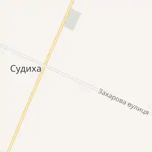 Село Судиха знаходиться за 1,5 км від річки Вошива (правий берег). На відстані 1,5 км розташоване село Шевченкове.