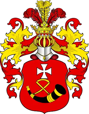 | Опис герба: Щит: на червоному полі срібний хрест і золотий ріг висячий на шнурку. Нашоломник. Три страусиних пір'їни[1] | |