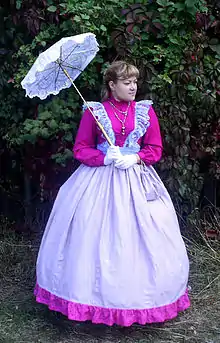 Зміна силуету жіночого костюма відбувається в 1866—1867 роках. Лінію талії розташовують високо. Спідниця сукні легко розширюється донизу, що створювало враження високого зросту. Після довготривалого домінування округлих форм та ліній по закону контрасту виникають нові пропорції, прямі лінії та кути. Ранкові туалети відрізнялися тим, що вони були дещо вужчі та підняті на ґудзики, на відміну від вечірніх, візитних і бальних. Для прогулянок пішки були короткі сукні або короткі спідниці з піднятими сукнями[4].