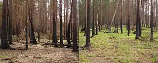 Вторинні сукцесії - це відновлення природної рослинності після певних порушень, наприклад, відновлення лісів після пожеж. Як приклад вторинної сукцесії зазвичай наводять ялиновий ліс, знищений пожежею. На займаній ним раніше території зберігся ґрунт і насіння. Трав'яне угрупування утвориться вже на наступний рік. Далі можливі варіанти: у вологому кліматі домінує ситник, потім він змінюється малиною, вона — осикою; у сухому кліматі переважає куничник, що змінюється шипшиною, а шипшина — березою.
