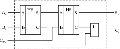 - Напівсуматор - бінарні (двохоперандні) суматори за модулем з розрядом перенесення, які характеризуються наявністю двох входів, на які подаються однойменні розряди двох чисел, і двох виходів: на одному реалізується арифметична сума по модулю в даному розряді, а на іншому - перенесення в наступний (старший) розряд.