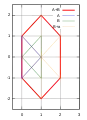 A + B = {(1, 0), (2, 1), (2, −1), (0, 1), (1, 2), (1, 0), (0, −1), (1, 0), (1, −2)} , яка виглядає як шестикутник, з трьома точками, що повторюються в (1, 0).
