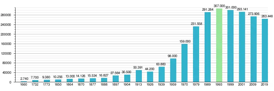 | Кількість мешканців. | 63 883 | 98 000 | 159 000 | 184 000 | 231 558 | 291 264 | 307 000 | 305 000 | 302 000 | 301 000 | 293 141 | 282 198 | 281 600 | |