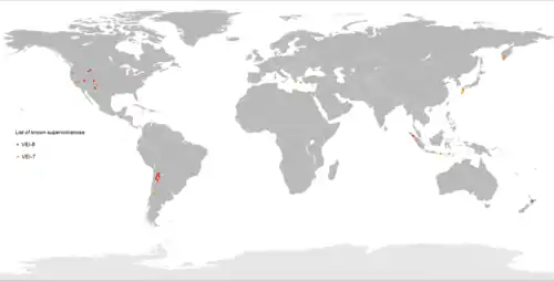 Супервулкани створюють кальдери, — їх виявлено на Землі понад 20 у Північній Америці, Південній Америці, Італії, Індонезії, Філіппінах, Японії, Новій Зеландії: Єллоустонська кальдера, Кальдера долини Лонг, Ла-Гаріта-Кальдера, Місема-Кальдера, Таупо, Тоба, Церро Галан, Пакана-Кальдера та ін.