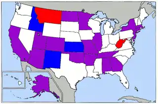 24 штати проводили конкурси або праймеріз у Супервівторок 2008го. Синій тільки конкурси у демократів, Червоний тільки вибори у республіканців і Фіолетовий вибори і у республіканців, і у демократів