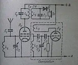 На схемі зображено простий супергетеродин на електронних лампах. Частина, обведена пунктиром, — це гетеродин (генератор частоти). Котушка індуктивності L2 індуктивно пов'язана з L3, за рахунок чого між анодним і сітковим колом гетеродина виникає позитивний зворотний зв'язок і лампа Лг генерує коливання, частота яких визначається параметрами елементів C3 (змінний конденсатор, вісь якого механічно пов'язана зі змінним конденсатором вхідного контуру C2), C4 і L2. Сигнал гетеродина надходить на другу сітку лампи-змішувача Лс, а на першу сітку цієї лампи надходить слабкий сигнал станції, що приймається. У процесі змішування вхідного і гетеродинного сигналу на аноді лампи Лс з'являються сигнали частот, що дорівнюють сумі і різниці частот на сітках. Одна з цих частот виділяється контуром проміжної частоти L4 С6, з яким індуктивно пов'язаний ще один контур L5 C7 — два цих контури утворюють смуговий фільтр. Після детектування діодом Д сигнал радіостанції можна чути у навушниках Тл.[1]