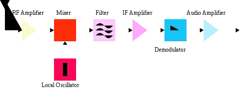 Радіосигнал з антени подається на вхід підсилювача високої частоти (в спрощеному варіанті він може бути відсутнім), а потім на вхід змішувача - спеціального елемента з двома входами і одним виходом, що здійснює операцію перетворення сигналу по частоті. На другий вхід змішувача подається сигнал з локального малопотужного генератора високої частоти - гетеродина. Коливальний контур гетеродина перенастроюється одночасно (синхронно) з вхідним контуром змішувача (і контурами підсилювача ВЧ) - зазвичай конденсатором змінної ємності (КЗЄ), рідше котушкою змінної індуктивності ( КЗІ, варіометром, ферроваріометром). Для цього підстроювальні елементи КЗЄ (пластини) або КЗІ (осердя) конструктивно виконані на одній підстроювальній осі. Таким чином, на виході змішувача утворюються сигнали з частотою, рівною сумі та різниці частот гетеродина і прийнятої радіостанції. Різницевий сигнал постійної проміжної частоти (ПЧ) виділяється за допомогою смугового фільтра і посилюється в підсилювачі ПЧ, після чого надходить до демодулятора (детектор) який відновлює сигнал низької (звукової) частоти.