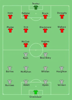 Гра завершилася унічию 1:1 (по голу забили Джон Барнс за «Ліверпуль» і Клейтон Блекмор за «Манчестер Юнайтед»). За тогочасним регламентом змагання обидві команди стали володарями Суперкубка.