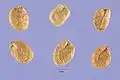 Насіння овальне, стиснуте, сірувато-коричневе зі слабким блиском. Поверхня насіння майже рівна.