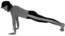 | 5 | Парватасана | поза планки чи поза гори | Праву ногу відсунути до лівої, випрямитися в попереку. | видихаючи | ![]() | |
