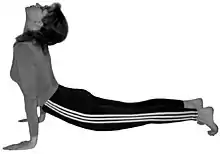 | 7 | Урдхва Мукха Шванасана | поза собаки мордою до гори | Випрямити руки з аштанга намаскар, не змінюючи положення долонь і ступень. Вигнути задню поверхню тіла від п'ят до маківки. | з вдихом | ![]() | |