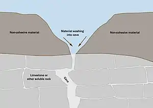- 1) Вилуговування розчинних речовин і винесення дрібних частинок з гірських порід підземними водами. Викликає осідання порід, що залягають вище, та утворення понижень на поверхні (блюдця, лійки тощо).