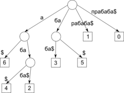 прабаба. Кожен підрядок завершується спеціальним символом $. Сім шляхів від кореня до листів (показані квадратами) відповідають семи суфіксам.Визначення